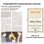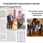 Eine von der Kolpingfamilie ins Leben gerufene Einrichtung, ist die seit 1987 jährlich stattfindende „Ehrung des verdienten Bürgers der Stadt“. Diesen Ehrentitel erhalten Mitbürger, die sich durch ein besonderes ehrenamtliches Engagement in unserer Stadt für ihre Mitmenschen einsetzen, aber wenig im Blickfeld der Öffentlichkeit stehen. Sie soll den Menschen in Kaiserslautern vor Augen führen, dass es in der heutigen „Ellenbogengesellschaft“ noch Personen gibt, die oft in aller Stille und Bescheidenheit, ohne eigene Vorteile davon zu haben, ehrenamtlich in Einrichtungen tätig sind oder zum Wohle der Mitmenschen eigene Initiativen verwirklichen. Mit dieser Ehrung konnten bisher 32 Frauen und Männer ausgezeichnet werden.